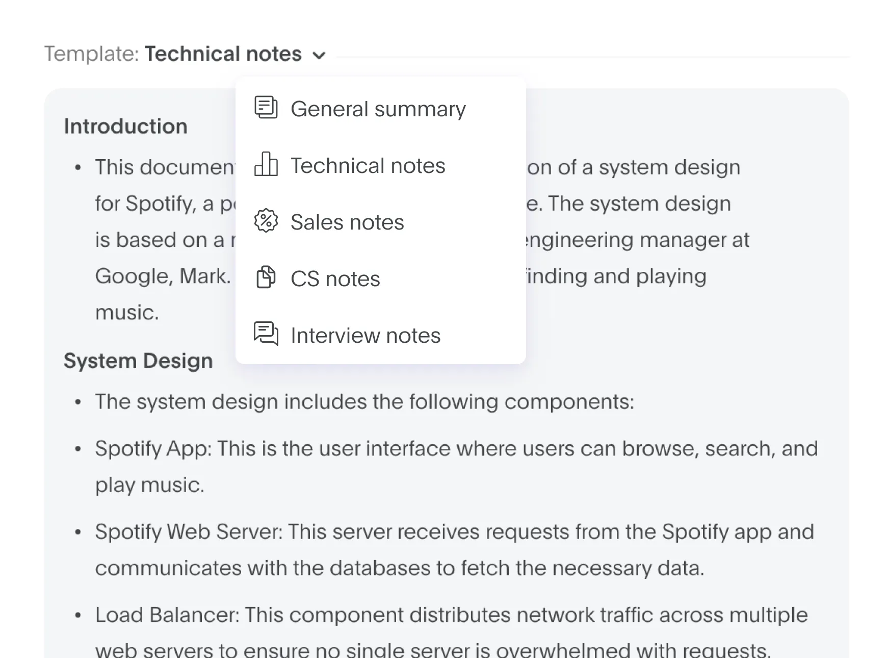 Customize AI meeting notes using your own prompt and template. Control the structure and level of detail