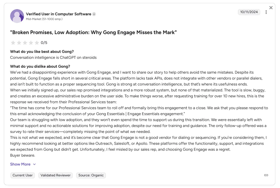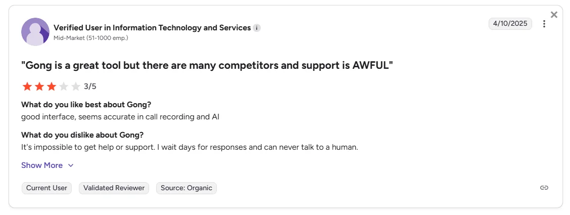 These issues are especially common with Gong Engage. Several teams attempting to train new hires or troubleshoot integrations found that Gong’s support team disengaged partway through the process.