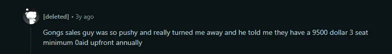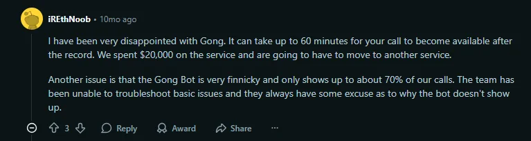 In one case, a user claimed that Gong required a $9,500 minimum for a three-seat license paid upfront, which they found off-putting due to an overly aggressive pitch.
