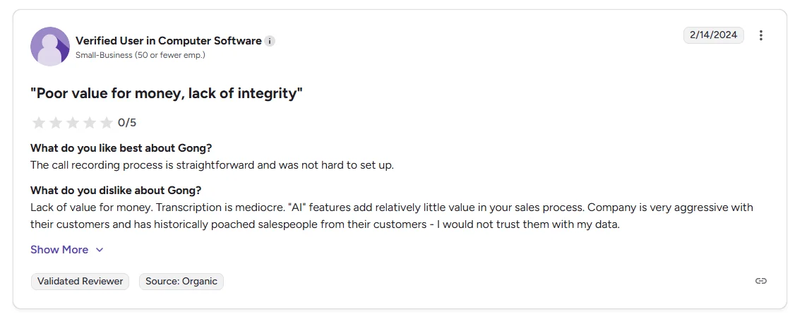 Additionally, at least one verified reviewer alleged that Gong has recruited sales professionals directly from client companies — obviously, a questionable business practice at best. While there's no way to verify these claims, hearing that stuff from verified reviewers is not a great look for Gong.