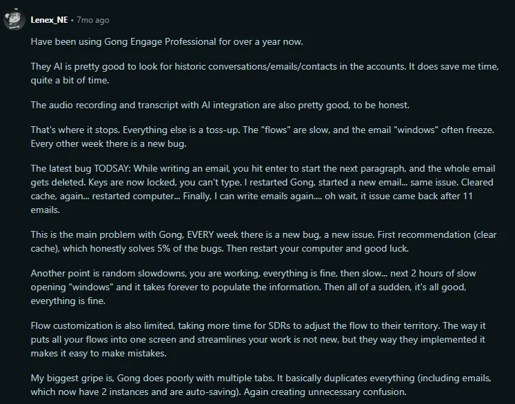 However, Gong’s more advanced modules — such as Engage for outreach or email flows — are riddled with lag, frequent bugs, and freezing issues. One user described losing entire emails mid-draft and needing to restart the program multiple times per week.