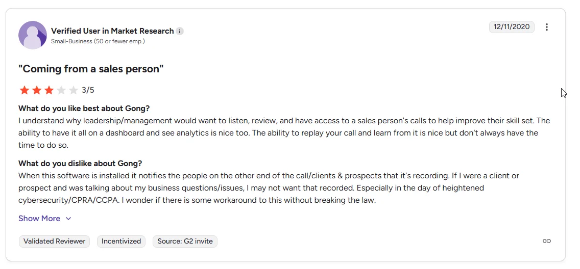 After trying out Gong ourselves, we researched the most common complaints from revenue teams around the world — on Reddit and verified review platforms, like G2 and Capterra. We focused on feedback from actual sales reps, and weeded out paid reviews and fake promotional materials.