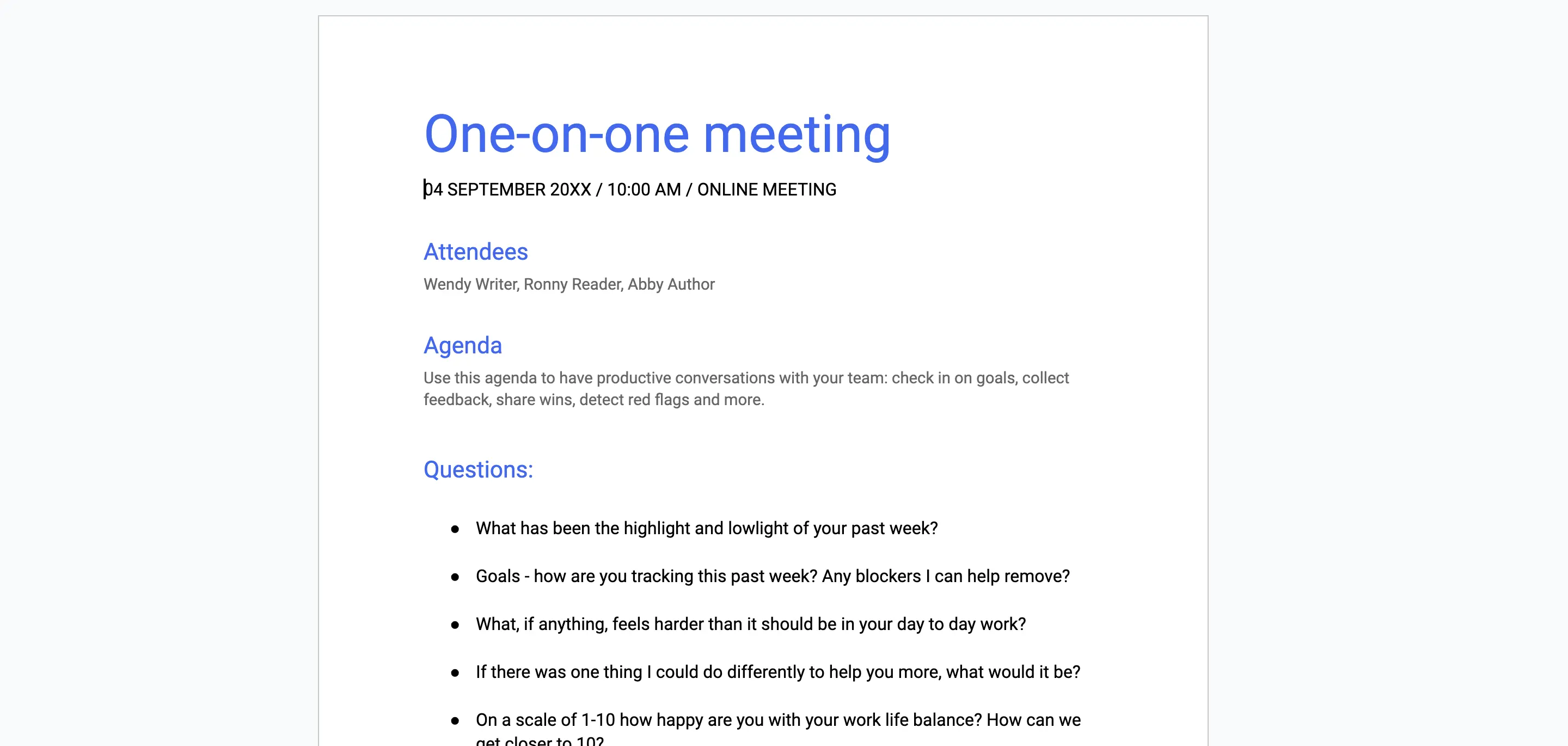 Optimize one-on-one meetings with our expertly designed templates, tailored to enhance communication, build trust, and foster professional growth. These templates guide managers and employees through structured, productive discussions, focusing on performance feedback, goal setting, and career development. By streamlining these crucial interactions, our templates not only boost employee engagement and productivity but also contribute to a positive and collaborative work environment.